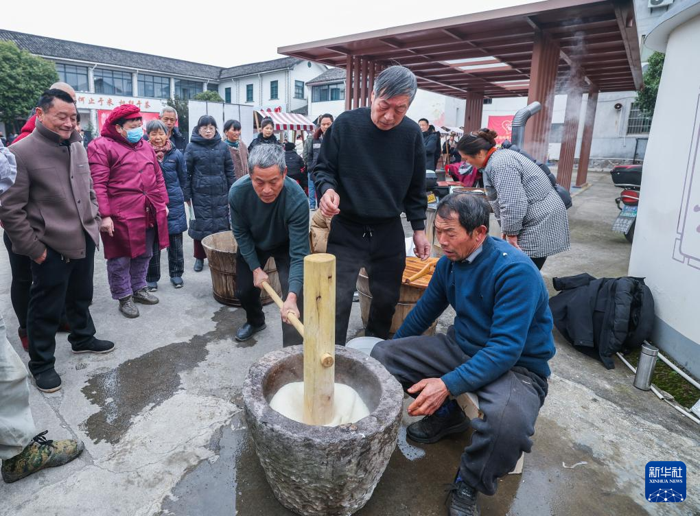 1月23日,村民们在东白湖镇乡村年味大集现场打麻糍。