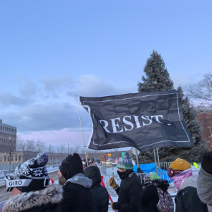 1月21日,人们在美国明尼苏达州明尼阿波利斯的惠普尔联邦大楼外抗议。美国移民与海关执法局等多个联邦机构的当地办事处都设在该大楼内。