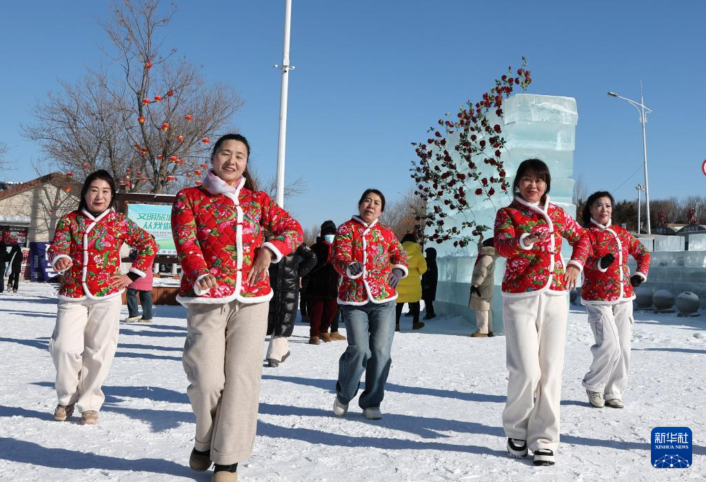 1月24日,在2026第十一届沈阳卧龙湖冬捕季活动现场,市民在雪地里跳广场舞。