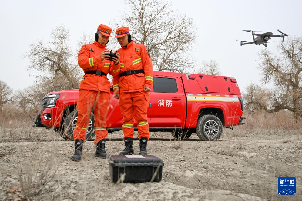 1月23日,在新疆巴音郭楞蒙古自治州尉犁县胡杨林区,消防员利用无人机进行空中巡护。
