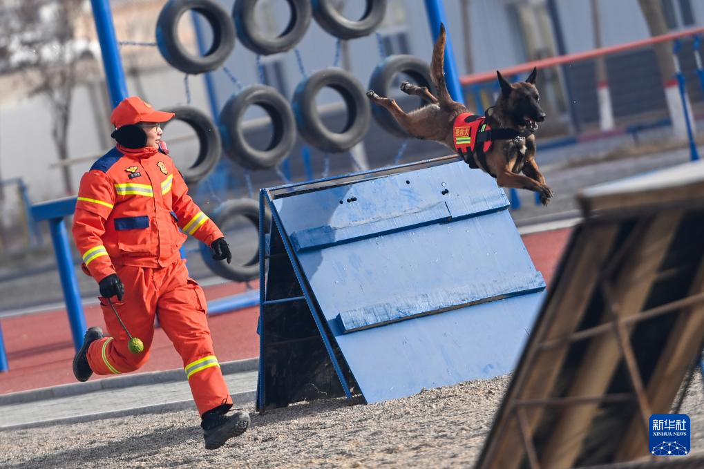 1月22日,在新疆乌鲁木齐消防救援机动支队库尔勒大队,消防员对搜救犬进行跃障训练。