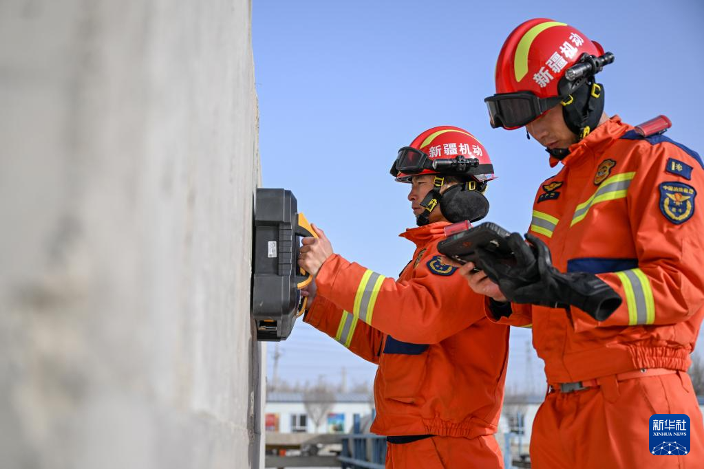 1月22日,在新疆乌鲁木齐消防救援机动支队库尔勒大队,消防员利用雷达生命探测仪,模拟对墙体一侧被困人员进行搜索标记。