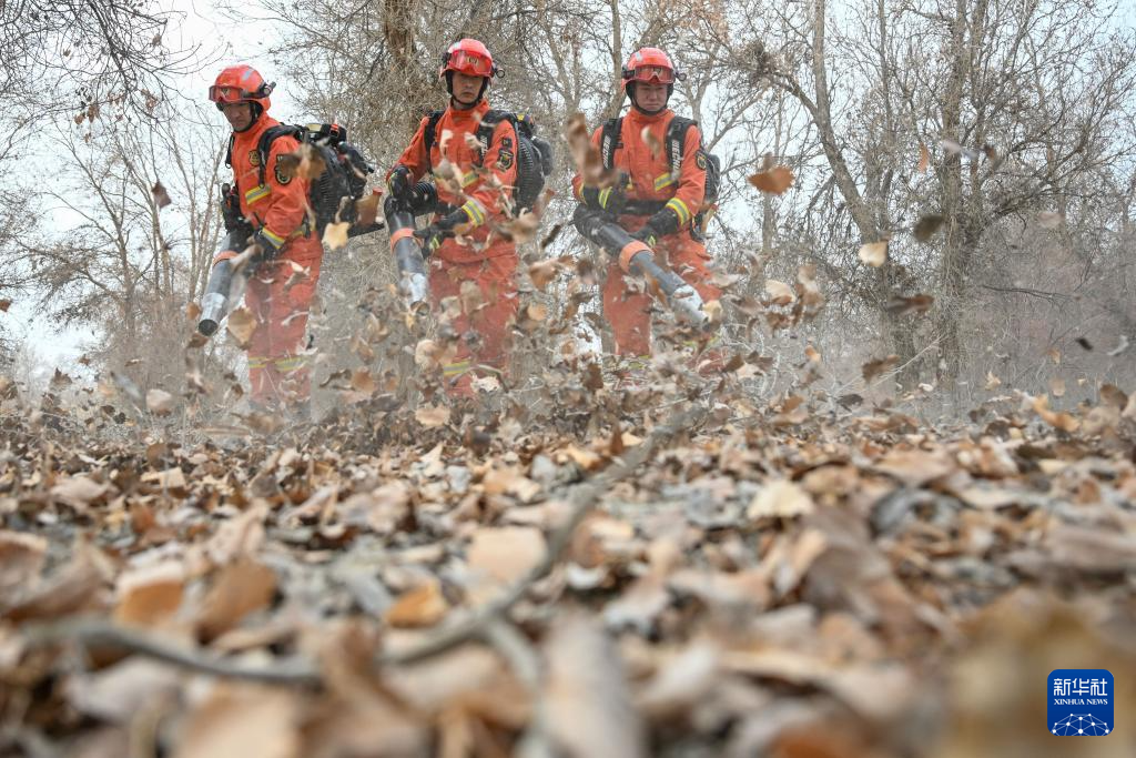 1月23日,在新疆巴音郭楞蒙古自治州尉犁县胡杨林区,消防员利用风力灭火机对可燃物堆积较多区域进行清理。