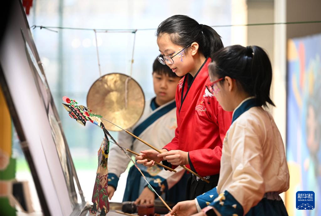 1月24日,在天津市少年儿童活动中心,小朋友在娃娃庙会上表演皮影戏。