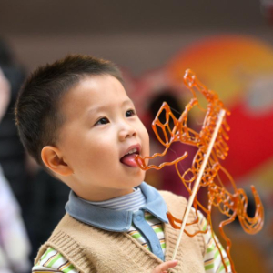 1月24日,在天津市少年儿童活动中心,一名小朋友在娃娃庙会上吃糖画。