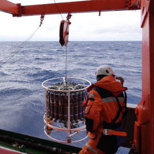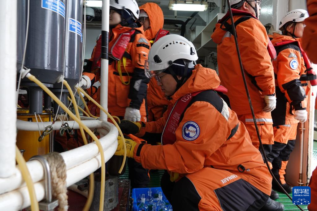 北京时间1月24日,“雪龙”号大洋队队员邢磊在舯部甲板采集从水下4000米获取的海水样品。