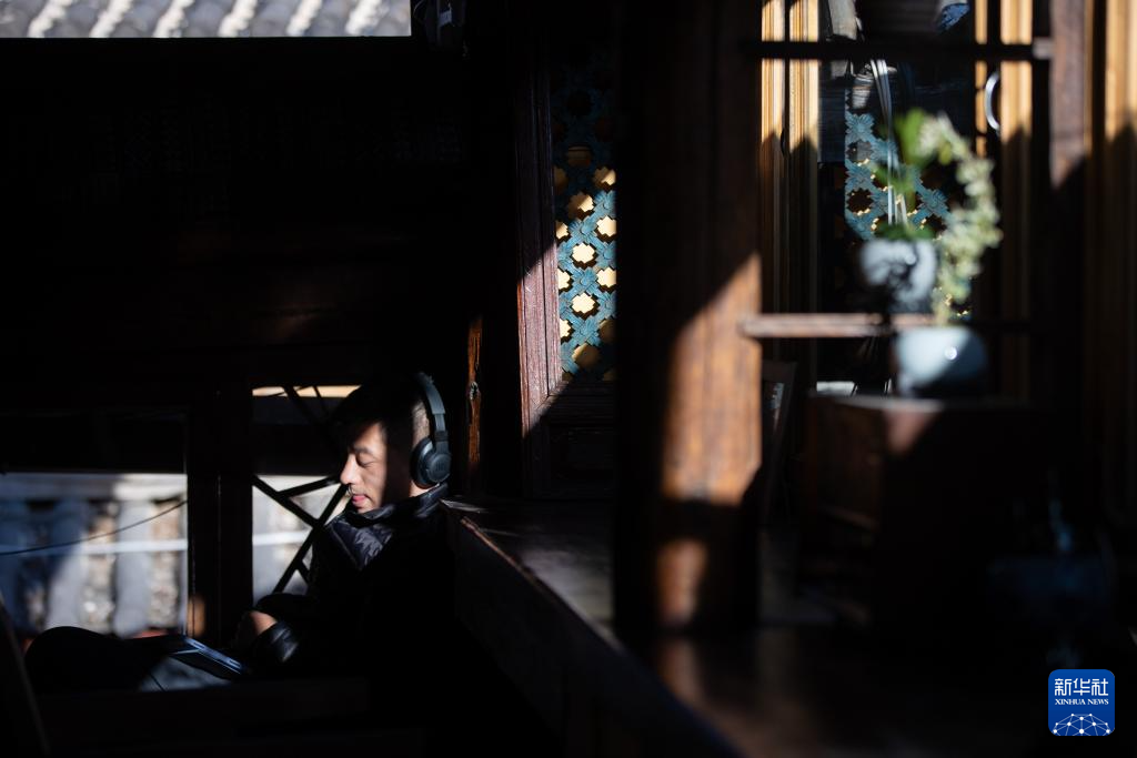 1月16日,客人在云南丽江古城“赶路人”音乐空间听音乐。