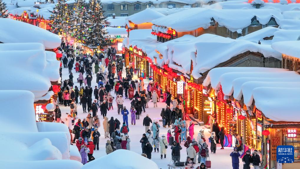 1月17日,游客在位于黑龙江省牡丹江市的“中国雪乡”景区游玩(无人机照片)。