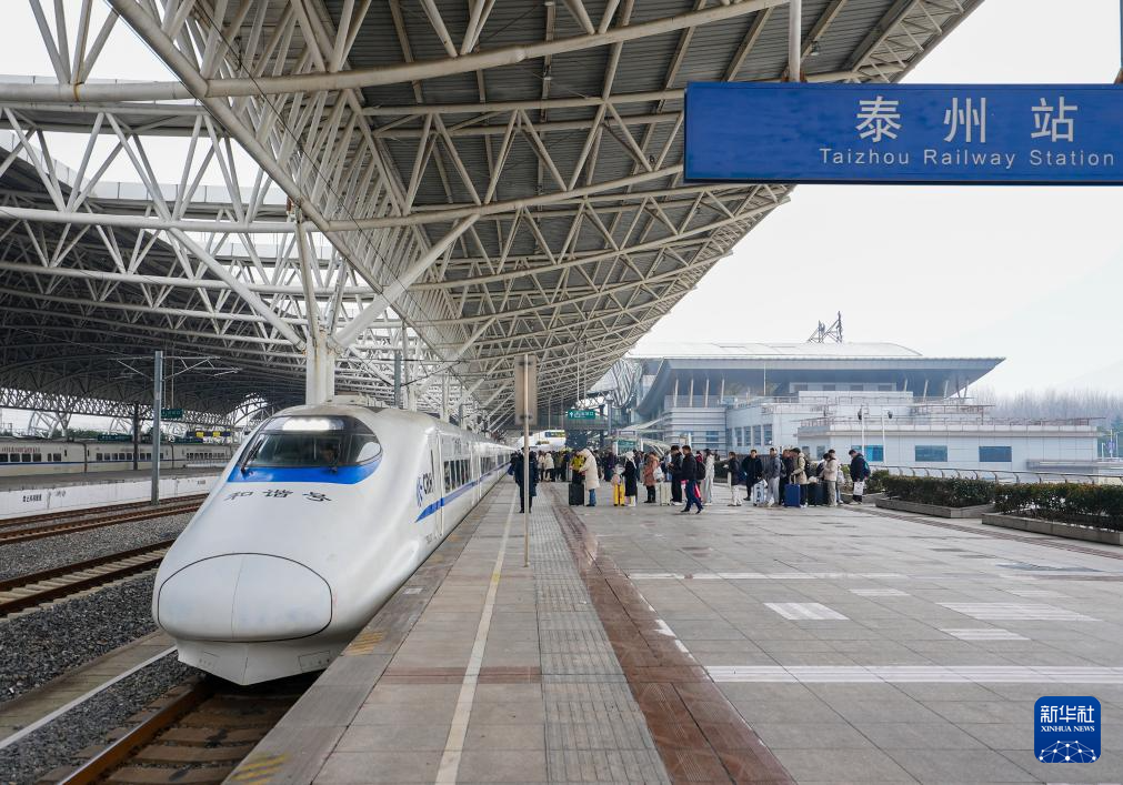 1月25日,旅客在江苏泰州站站台准备乘车出行。