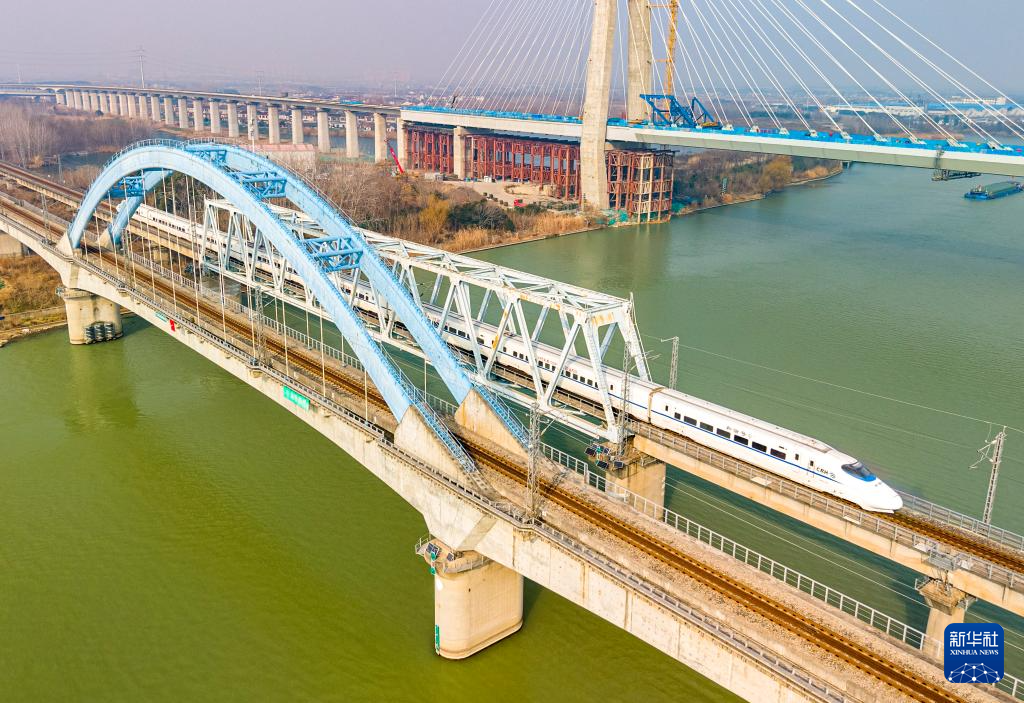 1月25日,一列动车组列车行驶在江苏省扬州市境内(无人机照片)。