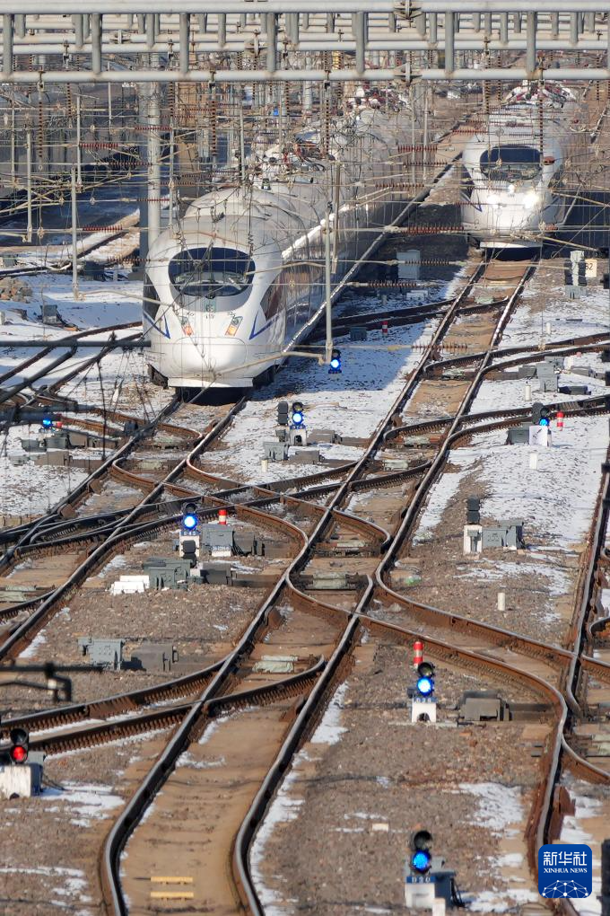 1月25日,在天津市滨海新区,动车组列车准备驶出天津滨海西站。