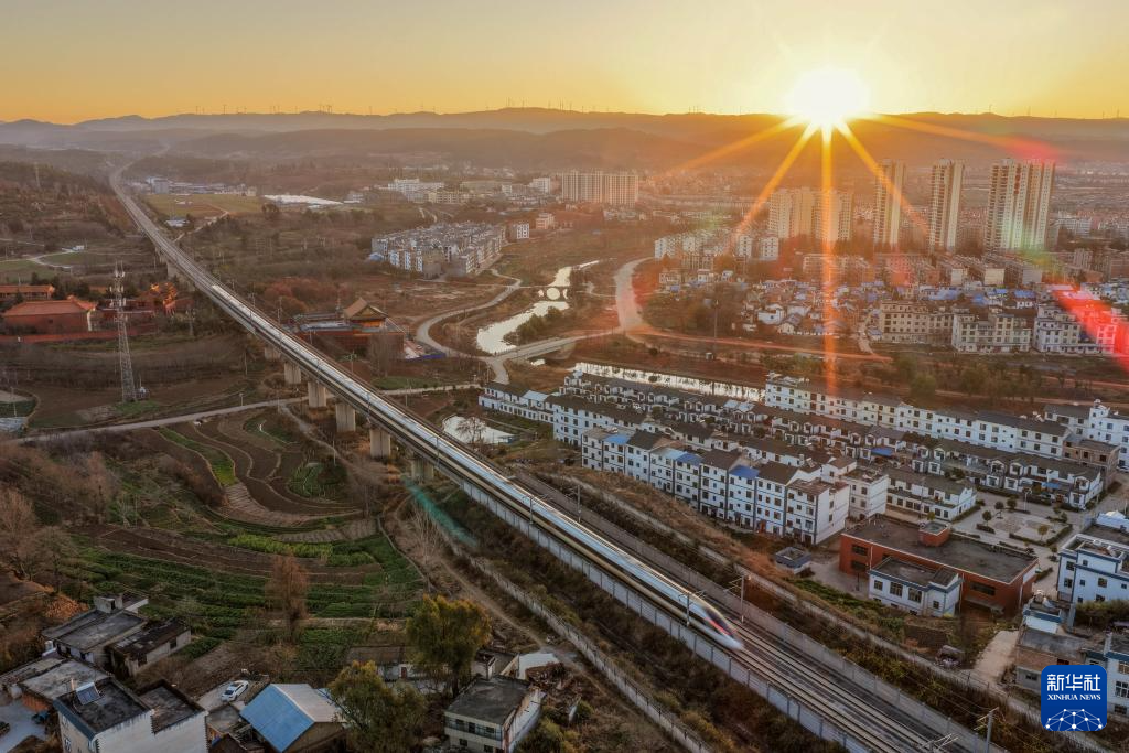 1月25日,一列动车组列车在云南省曲靖市境内行驶(无人机照片)。