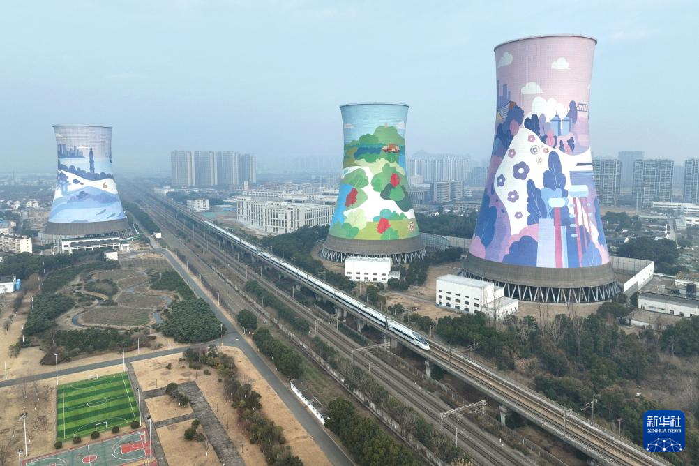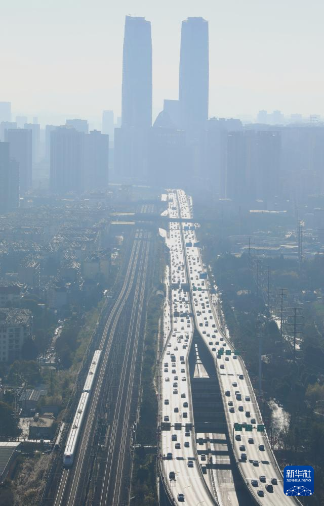 1月25日,列车行驶在江苏省泰州市海陵区境内(无人机照片)。