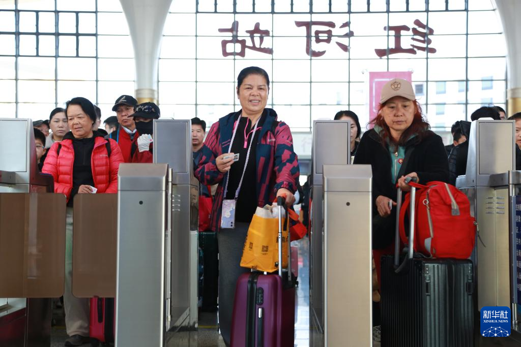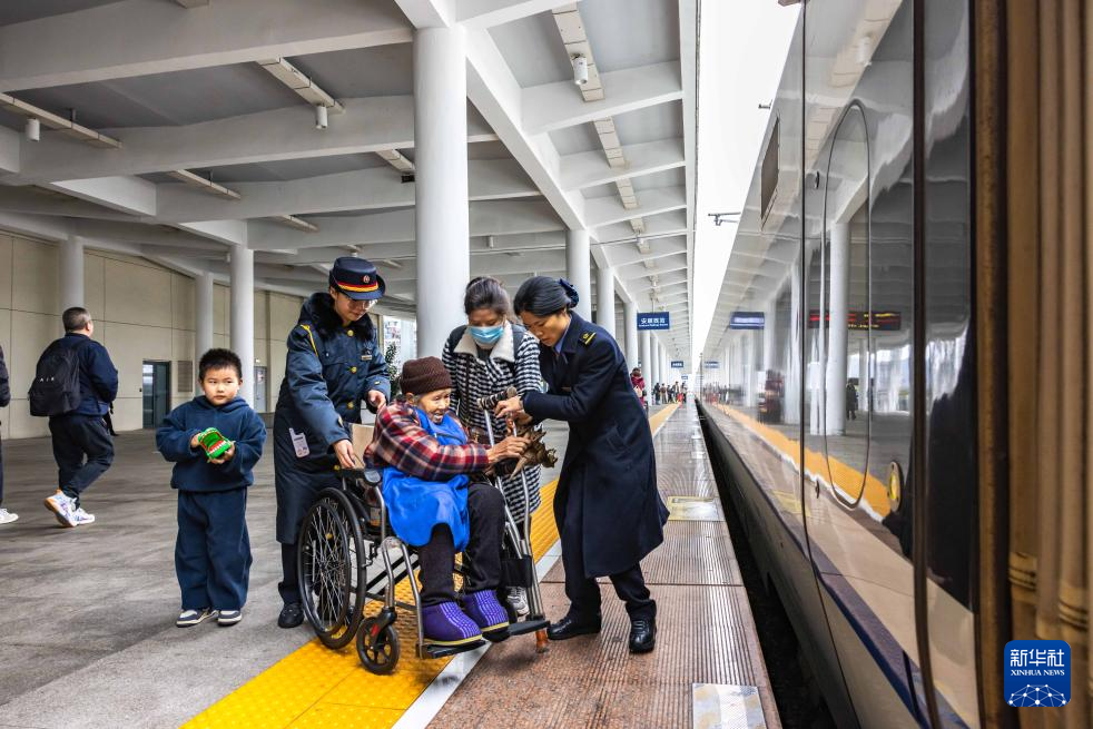 1月25日,铁路工作人员在贵州安顺西站协助重点旅客乘车。