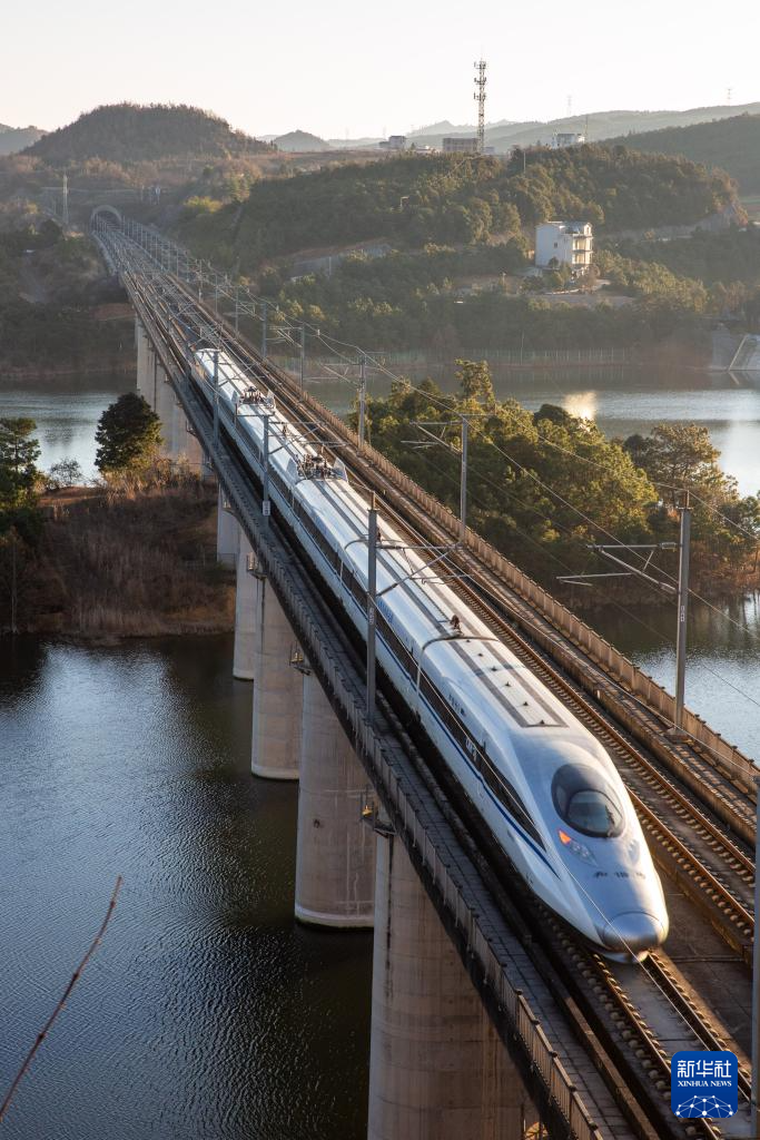 1月25日,动车组列车从云南省曲靖市马龙区旧县街道车马碧水库上驶过。