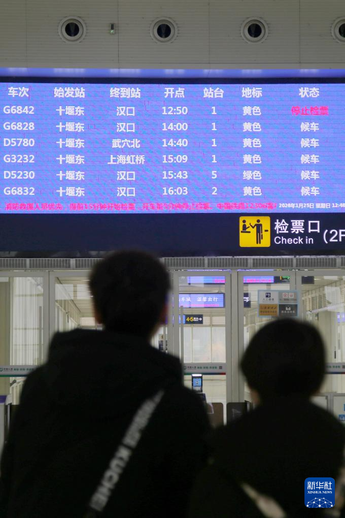 1月25日,旅客在湖北十堰东高铁站查看车次。
