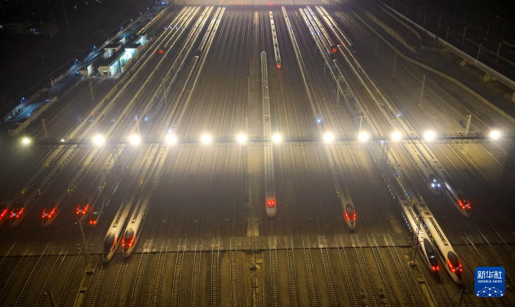 这是1月25日凌晨在昆明车辆段昆明南动车运用所拍摄的动车组列车(无人机照片)。