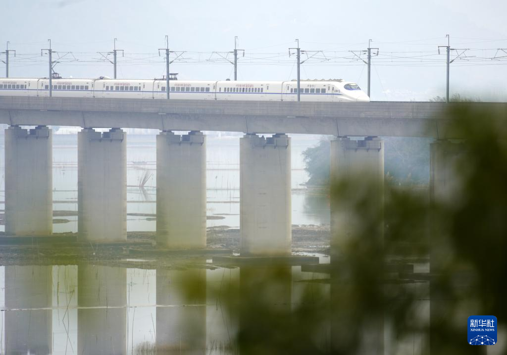 1月25日,动车组列车在福建省厦门市境内行驶。