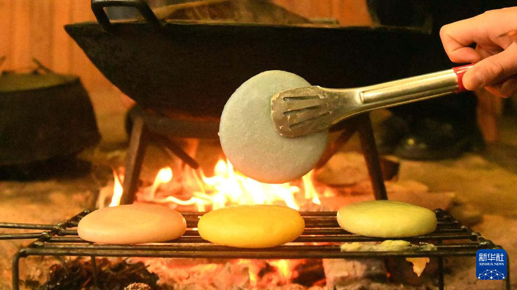 1月26日,在三江侗族自治县斗江镇牙林村,侗族群众在烤糍粑。