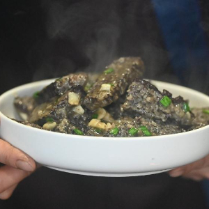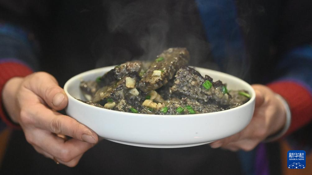 1月26日,在三江侗族自治县斗江镇牙林村,侗族群众在为腊八节欢庆宴烹制传统菜肴“鸭血糯”。