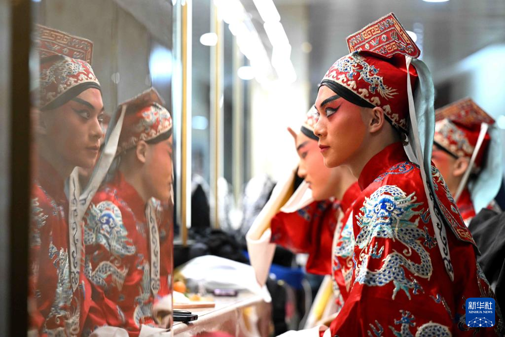 1月25日晚,中国戏曲学院演员在河北省石家庄市人民会堂表演京剧《龙凤呈祥》前试装。