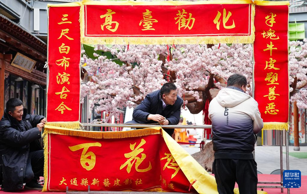 1月25日,在青海省西宁市城北区,周邦辉(中)与徒弟刘成玉(左)、儿子周德鹏搭建皮影戏台。