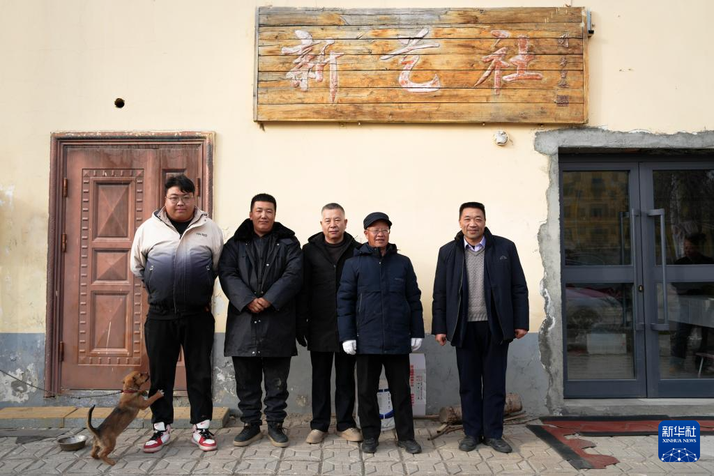 1月25日,在青海省西宁市大通回族土族自治县东柳村,新艺皮影社成员周德鹏、刘成玉、雷吉林、靳永义、周邦辉(从左至右)在出发前合影。