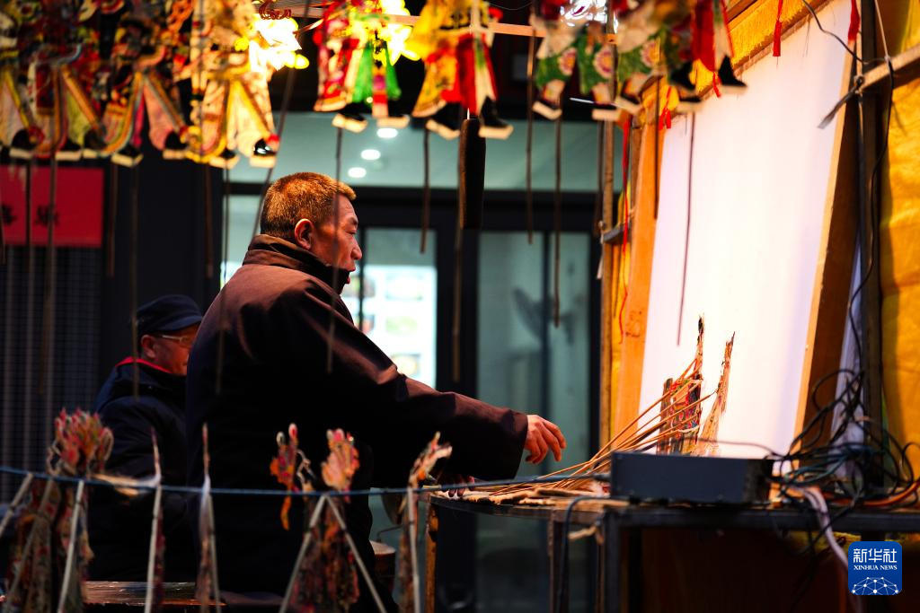 幕布轻挂,灯影流转,河湟皮影的独特唱腔在青海省西宁市城北区“冰雪烩”活动现场悠扬传开。俯身于幕布后翻飞皮影的,是河湟皮影戏国家级非物质文化遗产代表性传承人周邦辉。这已是他和皮影社今年在西宁“进城”演出的第5场。