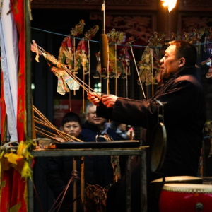 1月25日,周邦辉(右二)在青海省西宁市城北区表演皮影戏。