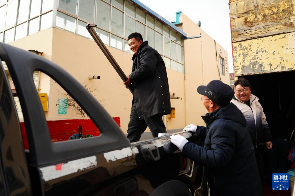 1月25日,新艺皮影社的成员刘成玉(左)、靳永义(中)与周德鹏将演出所用的道具和戏台架装车。
