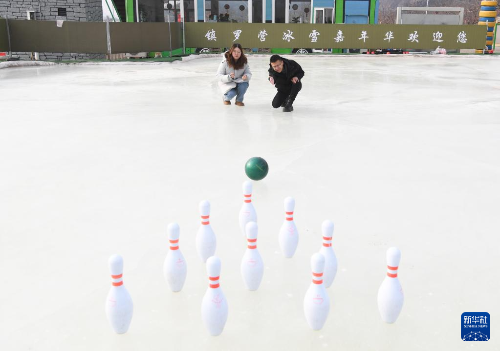 1月28日,在北京市平谷区镇罗营镇湖畔耕读园,游客在活动现场体验“冰上保龄球”。