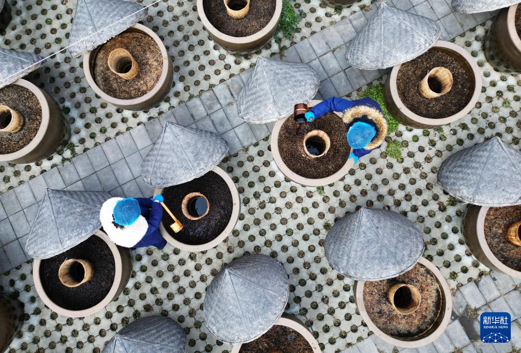 1月29日,滕州市一家传统酱油酿造企业的工人在晾晒场翻晒浇淋酱油。