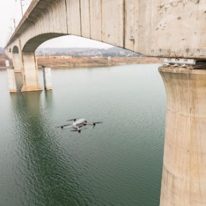 1月29日,在沪昆高铁湘江特大桥下,铁路工人操作无人机准备检测铁路桥墩上部结构外观。