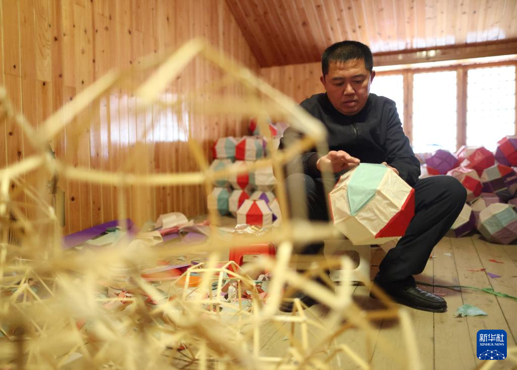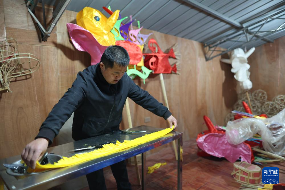 代鑫在制作毛龙的组成部分“八方灯”(1月27日摄)。