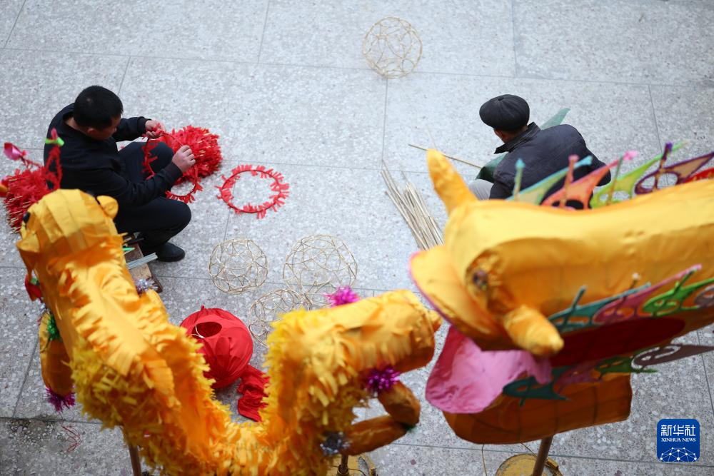 代鑫(右)和父亲在院子里制作毛龙(1月27日摄)。