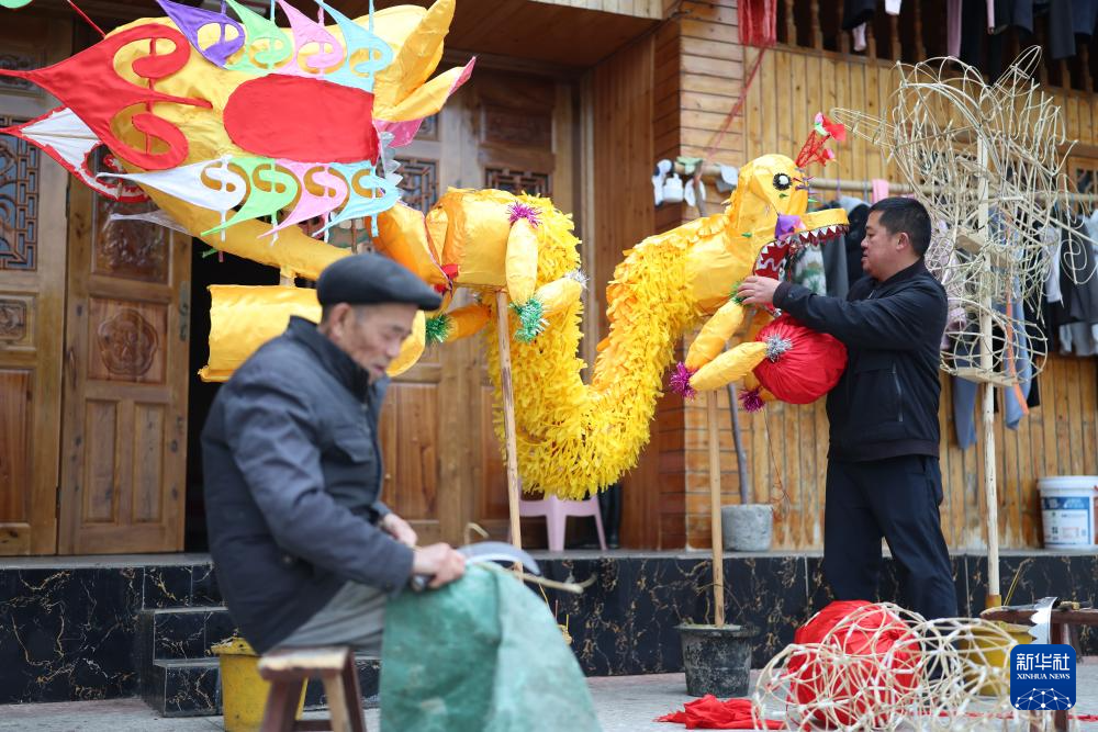 代鑫(左)和父亲一起在院子里制作毛龙(1月27日摄)。