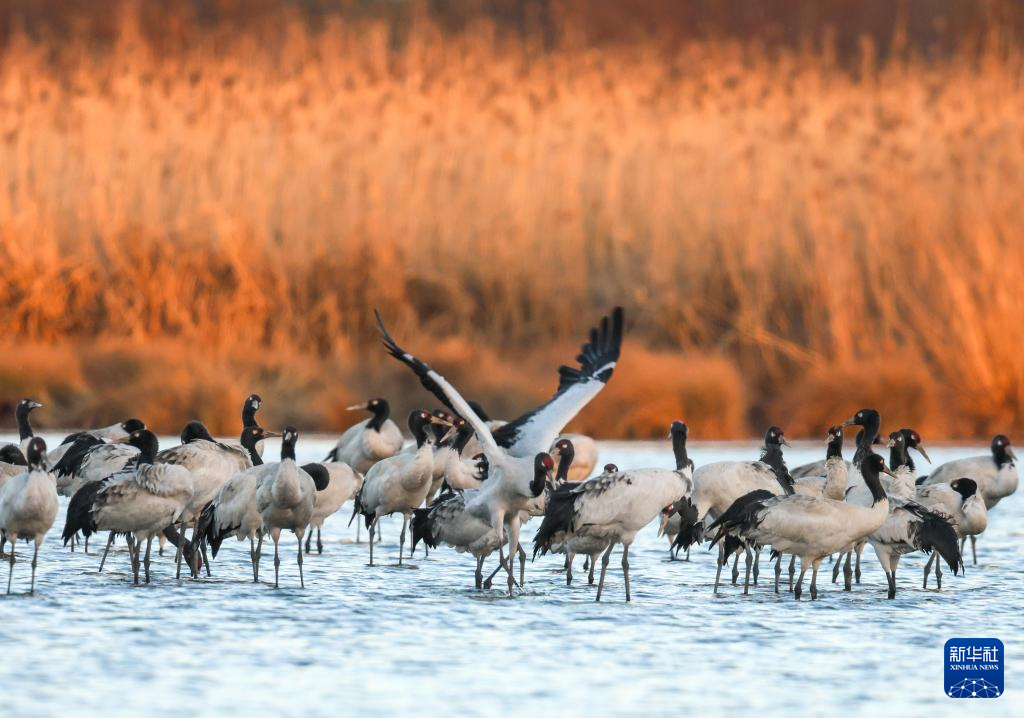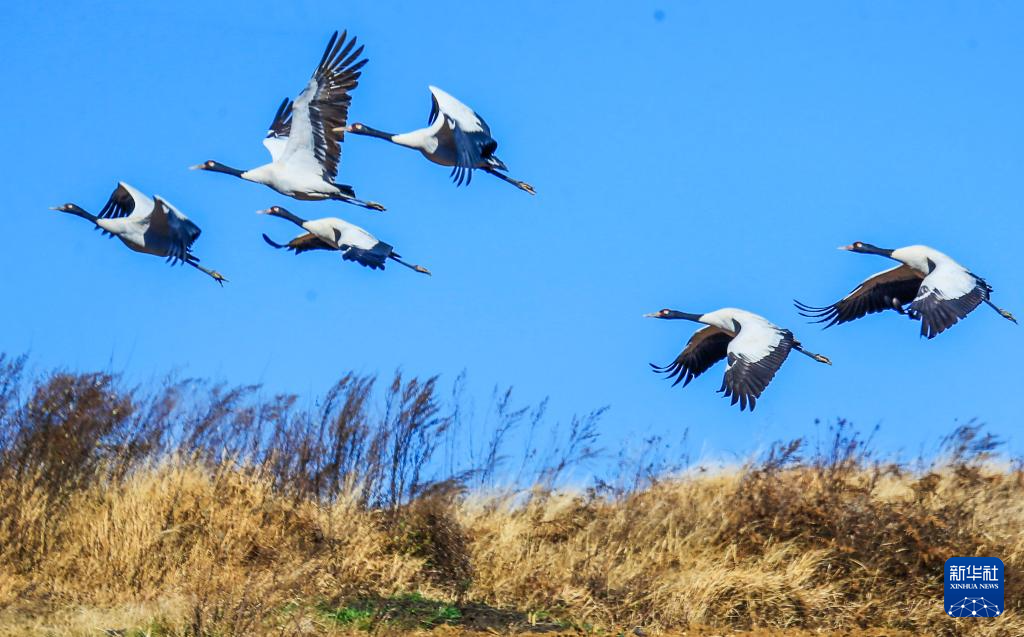 冬日,地处贵州省毕节市威宁县的草海国家级自然保护区呈现万鸟翔集的生态美景,黑颈鹤、灰鹤以及斑头雁等大批候鸟来此越冬。