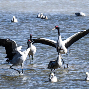 1月29日在贵州草海国家级自然保护区拍摄的越冬的黑颈鹤等鸟类。