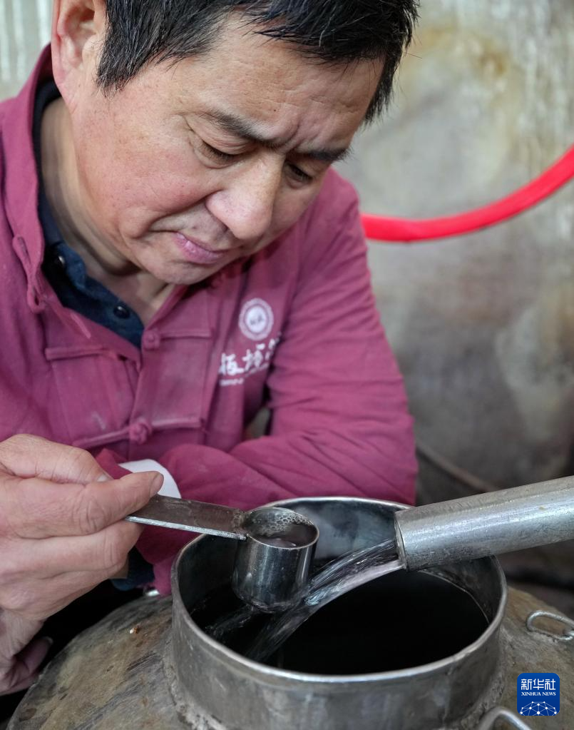 1月28日,河北省承德县承德乾隆醉酒业有限责任公司的工人在酿酒车间查看新酿酒的酒花。