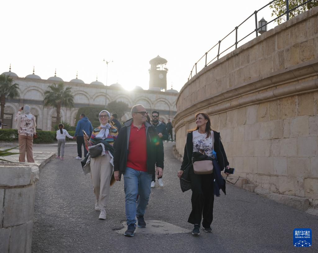 1月30日,游客在埃及开罗萨拉丁城堡内的穆罕默德·阿里清真寺前游览、合影。