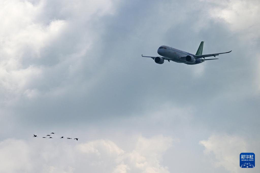 2月1日,在新加坡樟宜展览中心举行的新加坡航展媒体预演上,一架中国商飞的C919飞机进行飞行表演。