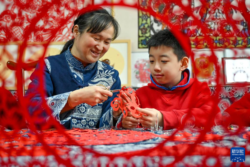 2月2日,在江苏省兴化市昭阳街道的毕飞宇工作室内,兴化市昭阳湖幼儿园的孩子们在老师的指导下创作以生肖马为主题的剪纸。