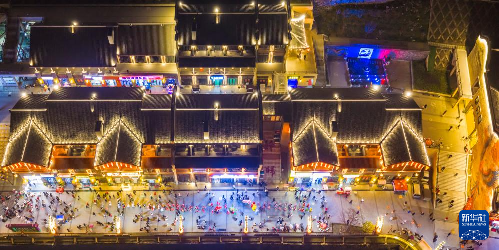 1月31日晚,湖北省宜昌市秭归县非遗传承人在九歌巷子举行龙狮巡游(无人机照片)。