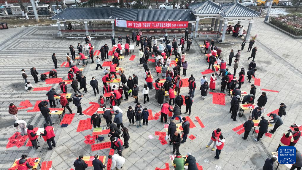 1月31日,河南省洛阳市汝阳县人民文化馆组织书法爱好者在刘伶广场给市民义写春联(无人机照片)。