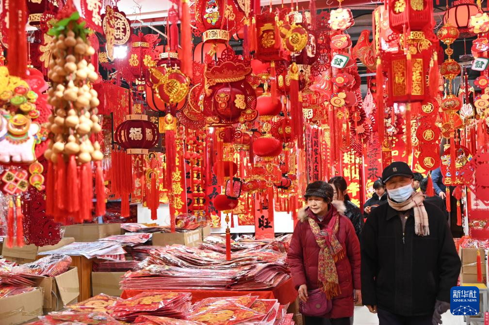 2月3日,市民在河南省开封市鼓楼区一年货市场选购春节饰品。