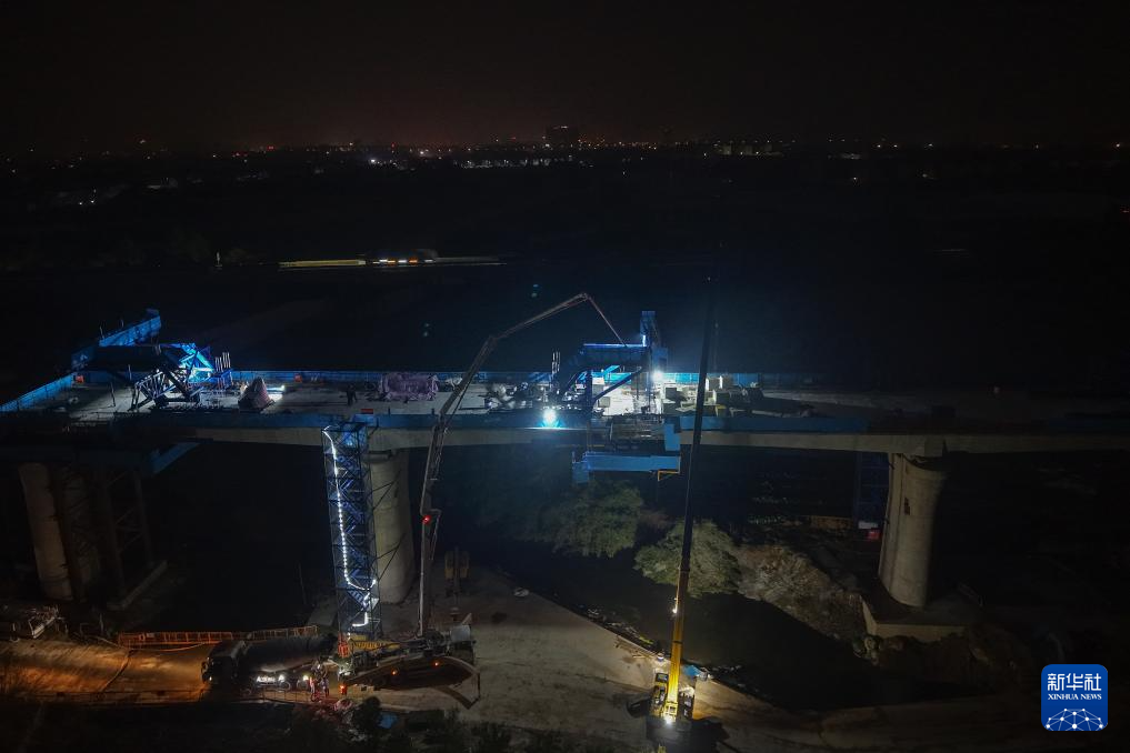 2月3日凌晨,建设者在衢丽铁路衢江特大桥跨芝溪连续梁合龙施工现场作业。
