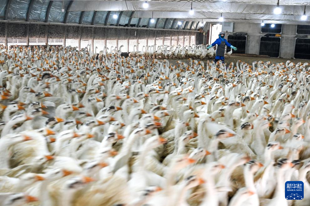 工人在贵州省锦屏县新化乡欧阳村的生态鹅育雏基地给种鹅投食(2026年1月21日摄)。