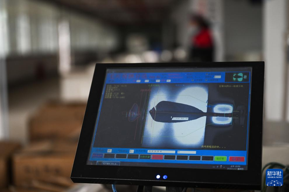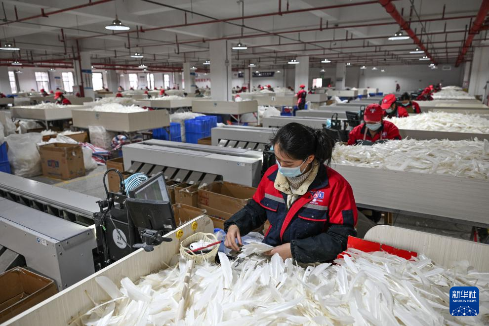 工人在贵州锦屏经济开发区羽毛球生产基地分级生产羽毛球所需的鹅毛(2026年1月22日摄)。