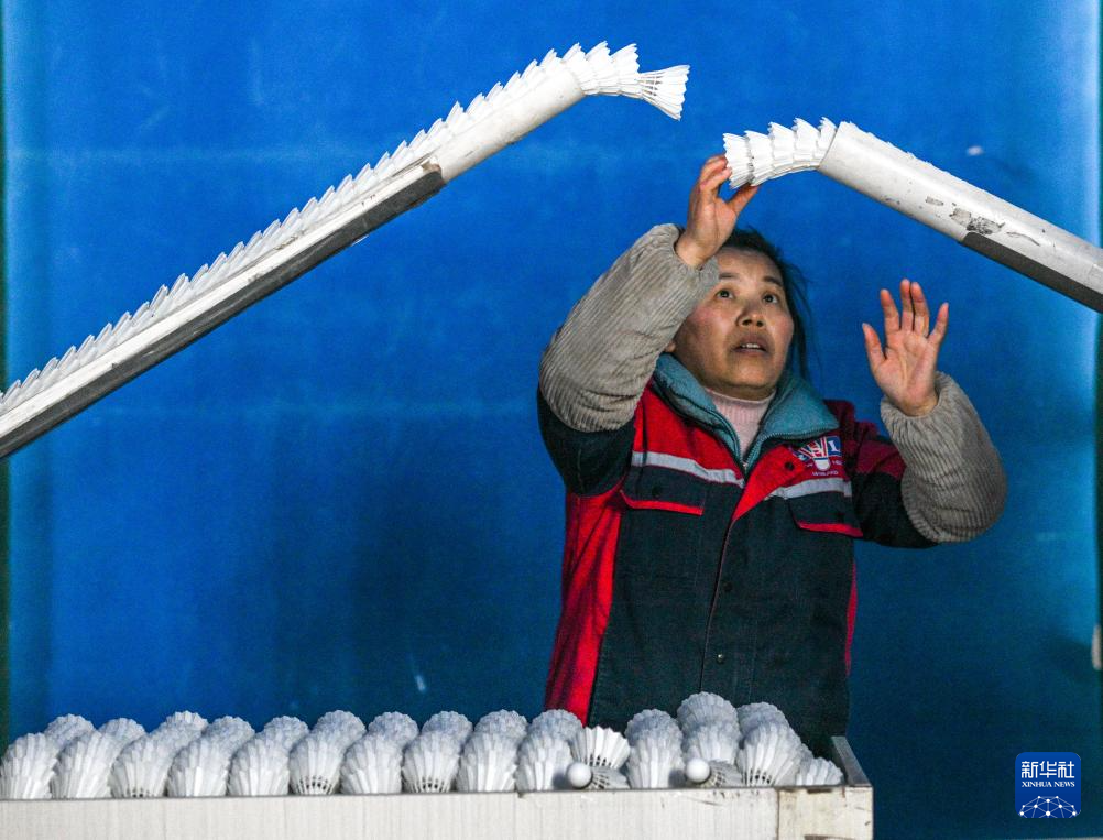 工人在贵州锦屏经济开发区羽毛球生产基地检查羽毛球成品(2026年1月22日摄)。