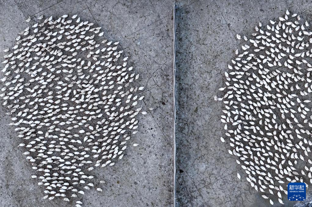 工人在贵州省锦屏县铜鼓镇马台生态种鹅养殖基地投放草料(2020年3月11日摄,无人机照片)。